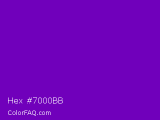 Hex #7000bb Color is a normal purple color and the nearest color is Violet RYB #8601af. Hex code #7000bb and RGB value is rgb(112,0,187). In RGB color space, this color is composed of 44% red, 0% green, 73% blue, In CMYK color space, this color is composed of 40% cyan, 100% magenta, 0% yellow , 27% black , In HSL color space, this color has a hue angle of 276° , 100% saturation and 37% lightness.