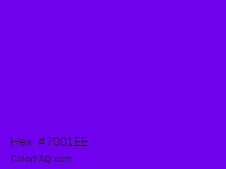 Hex #7001ee Color is a normal violet color and the nearest color is Electric Indigo #6f00ff. Hex code #7001ee and RGB value is rgb(112,1,238). In RGB color space, this color is composed of 44% red, 0% green, 93% blue, In CMYK color space, this color is composed of 53% cyan, 100% magenta, 0% yellow , 7% black , In HSL color space, this color has a hue angle of 268° , 99% saturation and 47% lightness.