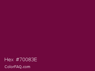Hex #70083e Color is a dark rose color and the nearest color is Tyrian Purple #66023c. Hex code #70083e and RGB value is rgb(112,8,62). In RGB color space, this color is composed of 44% red, 3% green, 24% blue, In CMYK color space, this color is composed of 0% cyan, 93% magenta, 45% yellow , 56% black , In HSL color space, this color has a hue angle of 329° , 87% saturation and 24% lightness.