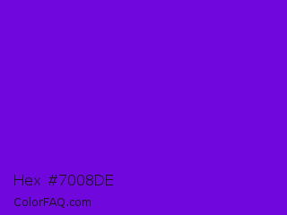 Hex #7008de Color is a normal violet color and the nearest color is French Violet #8806ce. Hex code #7008de and RGB value is rgb(112,8,222). In RGB color space, this color is composed of 44% red, 3% green, 87% blue, In CMYK color space, this color is composed of 50% cyan, 96% magenta, 0% yellow , 13% black , In HSL color space, this color has a hue angle of 269° , 93% saturation and 45% lightness.