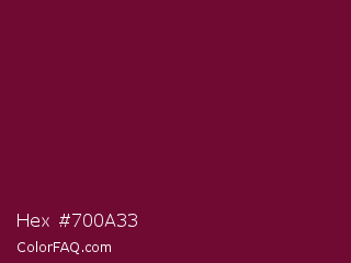 Hex #700a33 Color is a dark rose color and the nearest color is Black Rose #67032d. Hex code #700a33 and RGB value is rgb(112,10,51). In RGB color space, this color is composed of 44% red, 4% green, 20% blue, In CMYK color space, this color is composed of 0% cyan, 91% magenta, 54% yellow , 56% black , In HSL color space, this color has a hue angle of 336° , 84% saturation and 24% lightness.