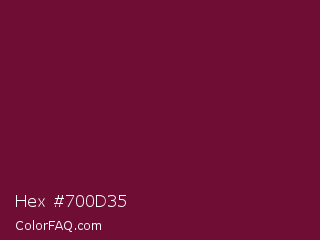 Hex #700d35 Color is a dark rose color and the nearest color is Black Rose #67032d. Hex code #700d35 and RGB value is rgb(112,13,53). In RGB color space, this color is composed of 44% red, 5% green, 21% blue, In CMYK color space, this color is composed of 0% cyan, 88% magenta, 53% yellow , 56% black , In HSL color space, this color has a hue angle of 336° , 79% saturation and 25% lightness.