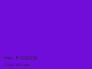 Hex #700ddb Color is a normal violet color and the nearest color is French Violet #8806ce. Hex code #700ddb and RGB value is rgb(112,13,219). In RGB color space, this color is composed of 44% red, 5% green, 86% blue, In CMYK color space, this color is composed of 49% cyan, 94% magenta, 0% yellow , 14% black , In HSL color space, this color has a hue angle of 269° , 89% saturation and 45% lightness.