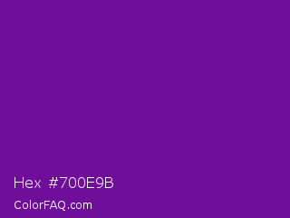 Hex #700e9b Color is a normal purple color and the nearest color is Purple #660099. Hex code #700e9b and RGB value is rgb(112,14,155). In RGB color space, this color is composed of 44% red, 5% green, 61% blue, In CMYK color space, this color is composed of 28% cyan, 91% magenta, 0% yellow , 39% black , In HSL color space, this color has a hue angle of 282° , 83% saturation and 33% lightness.