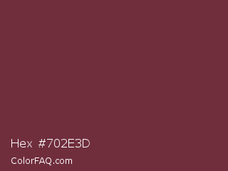 Hex #702e3d Color is a normal red color and the nearest color is Wine #722f37. Hex code #702e3d and RGB value is rgb(112,46,61). In RGB color space, this color is composed of 44% red, 18% green, 24% blue, In CMYK color space, this color is composed of 0% cyan, 59% magenta, 46% yellow , 56% black , In HSL color space, this color has a hue angle of 346° , 42% saturation and 31% lightness.