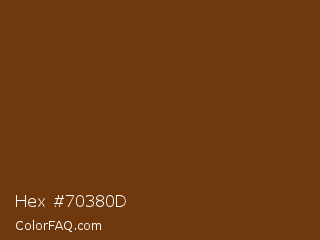 Hex #70380d Color is a dark orange color and the nearest color is Cafe Royale #6f440c. Hex code #70380d and RGB value is rgb(112,56,13). In RGB color space, this color is composed of 44% red, 22% green, 5% blue, In CMYK color space, this color is composed of 0% cyan, 50% magenta, 88% yellow , 56% black , In HSL color space, this color has a hue angle of 26° , 79% saturation and 25% lightness.
