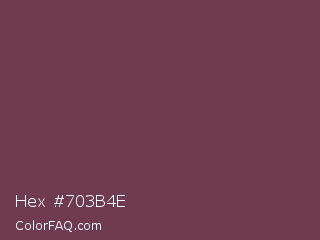 Hex #703b4e Color is a normal rose color and the nearest color is Ube Halaya #663854. Hex code #703b4e and RGB value is rgb(112,59,78). In RGB color space, this color is composed of 44% red, 23% green, 31% blue, In CMYK color space, this color is composed of 0% cyan, 47% magenta, 30% yellow , 56% black , In HSL color space, this color has a hue angle of 338° , 31% saturation and 34% lightness.
