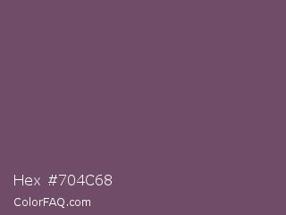 Hex #704c68 Color is a normal magenta color and the nearest color is Zambezi #685558. Hex code #704c68 and RGB value is rgb(112,76,104). In RGB color space, this color is composed of 44% red, 30% green, 41% blue, In CMYK color space, this color is composed of 0% cyan, 32% magenta, 7% yellow , 56% black , In HSL color space, this color has a hue angle of 313° , 19% saturation and 37% lightness.