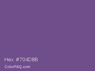 Hex #704d8b Color is a normal purple color and the nearest color is Affair #714693. Hex code #704d8b and RGB value is rgb(112,77,139). In RGB color space, this color is composed of 44% red, 30% green, 55% blue, In CMYK color space, this color is composed of 19% cyan, 45% magenta, 0% yellow , 45% black , In HSL color space, this color has a hue angle of 274° , 29% saturation and 42% lightness.