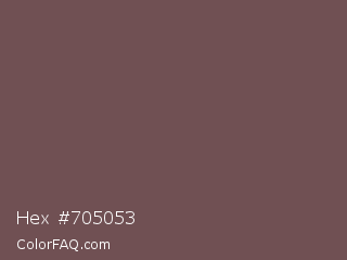 Hex #705053 Color is a normal red color and the nearest color is Ferra #704f50. Hex code #705053 and RGB value is rgb(112,80,83). In RGB color space, this color is composed of 44% red, 31% green, 33% blue, In CMYK color space, this color is composed of 0% cyan, 29% magenta, 26% yellow , 56% black , In HSL color space, this color has a hue angle of 354° , 17% saturation and 38% lightness.