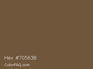 Hex #70563b Color is a normal orange color and the nearest color is Tuscan Brown Coffee #6f4e37. Hex code #70563b and RGB value is rgb(112,86,59). In RGB color space, this color is composed of 44% red, 34% green, 23% blue, In CMYK color space, this color is composed of 0% cyan, 23% magenta, 47% yellow , 56% black , In HSL color space, this color has a hue angle of 31° , 31% saturation and 34% lightness.