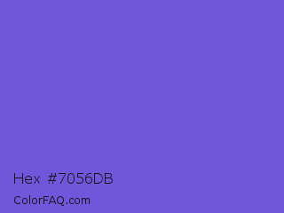 Hex #7056db Color is a normal indigo color and the nearest color is Slate Blue #6a5acd. Hex code #7056db and RGB value is rgb(112,86,219). In RGB color space, this color is composed of 44% red, 34% green, 86% blue, In CMYK color space, this color is composed of 49% cyan, 61% magenta, 0% yellow , 14% black , In HSL color space, this color has a hue angle of 252° , 65% saturation and 60% lightness.