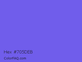 Hex #705deb Color is a light indigo color and the nearest color is Medium Slate Blue #7b68ee. Hex code #705deb and RGB value is rgb(112,93,235). In RGB color space, this color is composed of 44% red, 36% green, 92% blue, In CMYK color space, this color is composed of 52% cyan, 60% magenta, 0% yellow , 8% black , In HSL color space, this color has a hue angle of 248° , 78% saturation and 64% lightness.