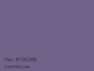 Hex #706288 Color is a normal violet color and the nearest color is Rum #796989. Hex code #706288 and RGB value is rgb(112,98,136). In RGB color space, this color is composed of 44% red, 38% green, 53% blue, In CMYK color space, this color is composed of 18% cyan, 28% magenta, 0% yellow , 47% black , In HSL color space, this color has a hue angle of 262° , 16% saturation and 46% lightness.