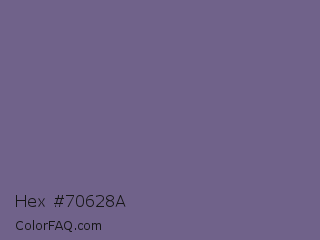 Hex #70628a Color is a normal violet color and the nearest color is Rum #796989. Hex code #70628a and RGB value is rgb(112,98,138). In RGB color space, this color is composed of 44% red, 38% green, 54% blue, In CMYK color space, this color is composed of 19% cyan, 29% magenta, 0% yellow , 46% black , In HSL color space, this color has a hue angle of 261° , 17% saturation and 46% lightness.