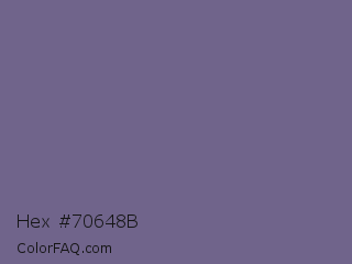 Hex #70648b Color is a normal indigo color and the nearest color is Rum #796989. Hex code #70648b and RGB value is rgb(112,100,139). In RGB color space, this color is composed of 44% red, 39% green, 55% blue, In CMYK color space, this color is composed of 19% cyan, 28% magenta, 0% yellow , 45% black , In HSL color space, this color has a hue angle of 258° , 16% saturation and 47% lightness.
