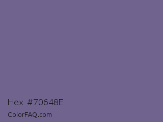 Hex #70648e Color is a normal indigo color and the nearest color is Rum #796989. Hex code #70648e and RGB value is rgb(112,100,142). In RGB color space, this color is composed of 44% red, 39% green, 56% blue, In CMYK color space, this color is composed of 21% cyan, 30% magenta, 0% yellow , 44% black , In HSL color space, this color has a hue angle of 257° , 17% saturation and 47% lightness.