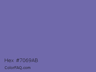 Hex #7069ab Color is a normal indigo color and the nearest color is Deluge #7563a8. Hex code #7069ab and RGB value is rgb(112,105,171). In RGB color space, this color is composed of 44% red, 41% green, 67% blue, In CMYK color space, this color is composed of 35% cyan, 39% magenta, 0% yellow , 33% black , In HSL color space, this color has a hue angle of 246° , 28% saturation and 54% lightness.