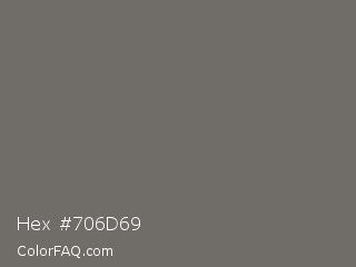 Hex #706d69 Color is a normal orange color and the nearest color is Dove Gray #6d6c6c. Hex code #706d69 and RGB value is rgb(112,109,105). In RGB color space, this color is composed of 44% red, 43% green, 41% blue, In CMYK color space, this color is composed of 0% cyan, 3% magenta, 6% yellow , 56% black , In HSL color space, this color has a hue angle of 34° , 3% saturation and 43% lightness.