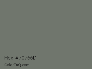 Hex #70766d Color is a normal green color and the nearest color is Nickel #727472. Hex code #70766d and RGB value is rgb(112,118,109). In RGB color space, this color is composed of 44% red, 46% green, 43% blue, In CMYK color space, this color is composed of 5% cyan, 0% magenta, 8% yellow , 54% black , In HSL color space, this color has a hue angle of 100° , 4% saturation and 45% lightness.