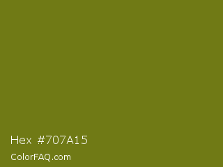 Hex #707a15 Color is a dark yellow color and the nearest color is Olivetone #716e10. Hex code #707a15 and RGB value is rgb(112,122,21). In RGB color space, this color is composed of 44% red, 48% green, 8% blue, In CMYK color space, this color is composed of 8% cyan, 0% magenta, 83% yellow , 52% black , In HSL color space, this color has a hue angle of 66° , 71% saturation and 28% lightness.