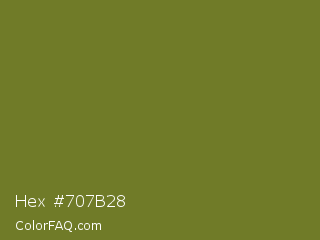 Hex #707b28 Color is a normal yellow color and the nearest color is Crete #737829. Hex code #707b28 and RGB value is rgb(112,123,40). In RGB color space, this color is composed of 44% red, 48% green, 16% blue, In CMYK color space, this color is composed of 9% cyan, 0% magenta, 67% yellow , 52% black , In HSL color space, this color has a hue angle of 68° , 51% saturation and 32% lightness.