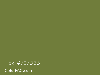 Hex #707d3b Color is a normal lime color and the nearest color is Pesto #7c7631. Hex code #707d3b and RGB value is rgb(112,125,59). In RGB color space, this color is composed of 44% red, 49% green, 23% blue, In CMYK color space, this color is composed of 10% cyan, 0% magenta, 53% yellow , 51% black , In HSL color space, this color has a hue angle of 72° , 36% saturation and 36% lightness.