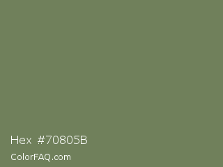 Hex #70805b Color is a normal green color and the nearest color is Limed Ash #747d63. Hex code #70805b and RGB value is rgb(112,128,91). In RGB color space, this color is composed of 44% red, 50% green, 36% blue, In CMYK color space, this color is composed of 13% cyan, 0% magenta, 29% yellow , 50% black , In HSL color space, this color has a hue angle of 86° , 17% saturation and 43% lightness.