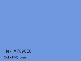Hex #7098e0 Color is a light blue color and the nearest color is Little Boy Blue #6ca0dc. Hex code #7098e0 and RGB value is rgb(112,152,224). In RGB color space, this color is composed of 44% red, 60% green, 88% blue, In CMYK color space, this color is composed of 50% cyan, 32% magenta, 0% yellow , 12% black , In HSL color space, this color has a hue angle of 219° , 64% saturation and 66% lightness.