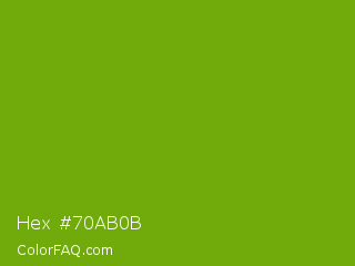 Hex #70ab0b Color is a normal green color and the nearest color is Christi #67a712. Hex code #70ab0b and RGB value is rgb(112,171,11). In RGB color space, this color is composed of 44% red, 67% green, 4% blue, In CMYK color space, this color is composed of 35% cyan, 0% magenta, 94% yellow , 33% black , In HSL color space, this color has a hue angle of 82° , 88% saturation and 36% lightness.