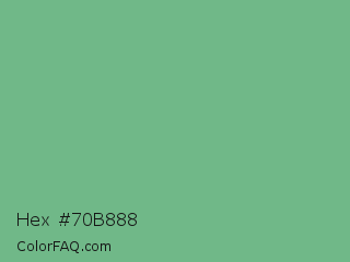 Hex #70b888 Color is a normal green color and the nearest color is Silver Tree #66b58f. Hex code #70b888 and RGB value is rgb(112,184,136). In RGB color space, this color is composed of 44% red, 72% green, 53% blue, In CMYK color space, this color is composed of 39% cyan, 0% magenta, 26% yellow , 28% black , In HSL color space, this color has a hue angle of 140° , 34% saturation and 58% lightness.