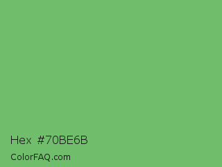 Hex #70be6b Color is a normal green color and the nearest color is Mantis #74c365. Hex code #70be6b and RGB value is rgb(112,190,107). In RGB color space, this color is composed of 44% red, 75% green, 42% blue, In CMYK color space, this color is composed of 41% cyan, 0% magenta, 44% yellow , 25% black , In HSL color space, this color has a hue angle of 116° , 39% saturation and 58% lightness.