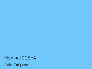 Hex #70c8fa Color is a light blue color and the nearest color is Maya Blue #73c2fb. Hex code #70c8fa and RGB value is rgb(112,200,250). In RGB color space, this color is composed of 44% red, 78% green, 98% blue, In CMYK color space, this color is composed of 55% cyan, 20% magenta, 0% yellow , 2% black , In HSL color space, this color has a hue angle of 202° , 93% saturation and 71% lightness.