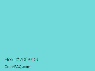 Hex #70d9d9 Color is a light cyan color and the nearest color is Aquamarine Blue #71d9e2. Hex code #70d9d9 and RGB value is rgb(112,217,217). In RGB color space, this color is composed of 44% red, 85% green, 85% blue, In CMYK color space, this color is composed of 48% cyan, 0% magenta, 0% yellow , 15% black , In HSL color space, this color has a hue angle of 180° , 58% saturation and 65% lightness.