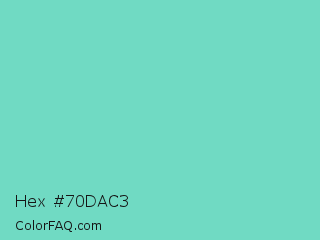 Hex #70dac3 Color is a light cyan color and the nearest color is Downy #6fd0c5. Hex code #70dac3 and RGB value is rgb(112,218,195). In RGB color space, this color is composed of 44% red, 85% green, 76% blue, In CMYK color space, this color is composed of 49% cyan, 0% magenta, 11% yellow , 15% black , In HSL color space, this color has a hue angle of 167° , 59% saturation and 65% lightness.