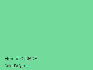 Hex #70db9b Color is a light green color and the nearest color is Medium Aquamarine #66ddaa. Hex code #70db9b and RGB value is rgb(112,219,155). In RGB color space, this color is composed of 44% red, 86% green, 61% blue, In CMYK color space, this color is composed of 49% cyan, 0% magenta, 29% yellow , 14% black , In HSL color space, this color has a hue angle of 144° , 60% saturation and 65% lightness.