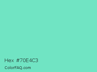 Hex #70e4c3 Color is a light green color and the nearest color is Bermuda #7dd8c6. Hex code #70e4c3 and RGB value is rgb(112,228,195). In RGB color space, this color is composed of 44% red, 89% green, 76% blue, In CMYK color space, this color is composed of 51% cyan, 0% magenta, 14% yellow , 11% black , In HSL color space, this color has a hue angle of 163° , 68% saturation and 67% lightness.