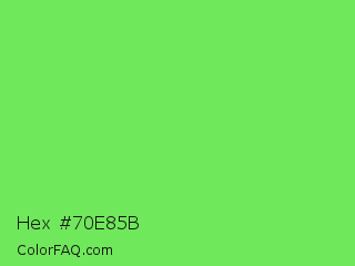 Hex #70e85b Color is a light green color and the nearest color is Screamin Green #66ff66. Hex code #70e85b and RGB value is rgb(112,232,91). In RGB color space, this color is composed of 44% red, 91% green, 36% blue, In CMYK color space, this color is composed of 52% cyan, 0% magenta, 61% yellow , 9% black , In HSL color space, this color has a hue angle of 111° , 75% saturation and 63% lightness.