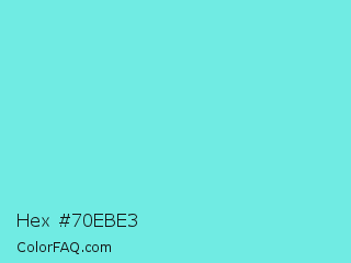 Hex #70ebe3 Color is a light cyan color and the nearest color is Turquoise Blue #6cdae7. Hex code #70ebe3 and RGB value is rgb(112,235,227). In RGB color space, this color is composed of 44% red, 92% green, 89% blue, In CMYK color space, this color is composed of 52% cyan, 0% magenta, 3% yellow , 8% black , In HSL color space, this color has a hue angle of 176° , 75% saturation and 68% lightness.