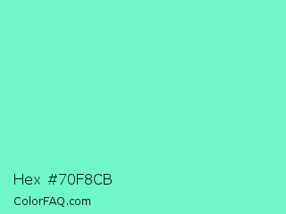 Hex #70f8cb Color is a light green color and the nearest color is Aquamarine #7fffd4. Hex code #70f8cb and RGB value is rgb(112,248,203). In RGB color space, this color is composed of 44% red, 97% green, 80% blue, In CMYK color space, this color is composed of 55% cyan, 0% magenta, 18% yellow , 3% black , In HSL color space, this color has a hue angle of 160° , 91% saturation and 71% lightness.