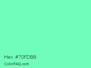 Hex #70fdbb Color is a light green color and the nearest color is Aquamarine #7fffd4. Hex code #70fdbb and RGB value is rgb(112,253,187). In RGB color space, this color is composed of 44% red, 99% green, 73% blue, In CMYK color space, this color is composed of 56% cyan, 0% magenta, 26% yellow , 1% black , In HSL color space, this color has a hue angle of 152° , 97% saturation and 72% lightness.