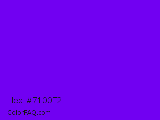 Hex #7100f2 Color is a normal violet color and the nearest color is Electric Indigo #6f00ff. Hex code #7100f2 and RGB value is rgb(113,0,242). In RGB color space, this color is composed of 44% red, 0% green, 95% blue, In CMYK color space, this color is composed of 53% cyan, 100% magenta, 0% yellow , 5% black , In HSL color space, this color has a hue angle of 268° , 100% saturation and 47% lightness.