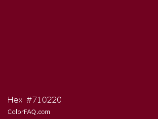 Hex #710220 Color is a dark rose color and the nearest color is Burgundy #800020. Hex code #710220 and RGB value is rgb(113,2,32). In RGB color space, this color is composed of 44% red, 1% green, 13% blue, In CMYK color space, this color is composed of 0% cyan, 98% magenta, 72% yellow , 56% black , In HSL color space, this color has a hue angle of 344° , 97% saturation and 23% lightness.