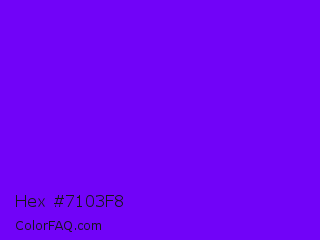 Hex #7103f8 Color is a normal violet color and the nearest color is Electric Indigo #6f00ff. Hex code #7103f8 and RGB value is rgb(113,3,248). In RGB color space, this color is composed of 44% red, 1% green, 97% blue, In CMYK color space, this color is composed of 54% cyan, 99% magenta, 0% yellow , 3% black , In HSL color space, this color has a hue angle of 267° , 98% saturation and 49% lightness.