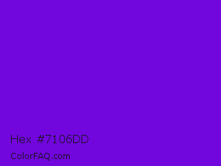 Hex #7106dd Color is a normal violet color and the nearest color is French Violet #8806ce. Hex code #7106dd and RGB value is rgb(113,6,221). In RGB color space, this color is composed of 44% red, 2% green, 87% blue, In CMYK color space, this color is composed of 49% cyan, 97% magenta, 0% yellow , 13% black , In HSL color space, this color has a hue angle of 270° , 95% saturation and 45% lightness.