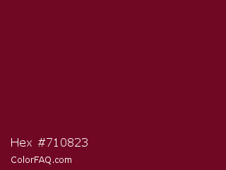 Hex #710823 Color is a dark red color and the nearest color is Black Rose #67032d. Hex code #710823 and RGB value is rgb(113,8,35). In RGB color space, this color is composed of 44% red, 3% green, 14% blue, In CMYK color space, this color is composed of 0% cyan, 93% magenta, 69% yellow , 56% black , In HSL color space, this color has a hue angle of 345° , 87% saturation and 24% lightness.