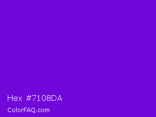 Hex #7108da Color is a normal violet color and the nearest color is French Violet #8806ce. Hex code #7108da and RGB value is rgb(113,8,218). In RGB color space, this color is composed of 44% red, 3% green, 85% blue, In CMYK color space, this color is composed of 48% cyan, 96% magenta, 0% yellow , 15% black , In HSL color space, this color has a hue angle of 270° , 93% saturation and 44% lightness.