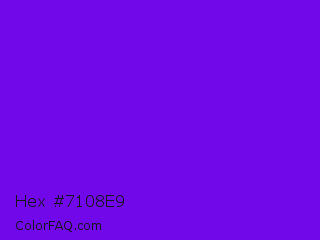 Hex #7108e9 Color is a normal violet color and the nearest color is Electric Indigo #6f00ff. Hex code #7108e9 and RGB value is rgb(113,8,233). In RGB color space, this color is composed of 44% red, 3% green, 91% blue, In CMYK color space, this color is composed of 52% cyan, 97% magenta, 0% yellow , 9% black , In HSL color space, this color has a hue angle of 268° , 93% saturation and 47% lightness.