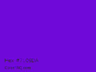 Hex #7109da Color is a normal violet color and the nearest color is French Violet #8806ce. Hex code #7109da and RGB value is rgb(113,9,218). In RGB color space, this color is composed of 44% red, 4% green, 85% blue, In CMYK color space, this color is composed of 48% cyan, 96% magenta, 0% yellow , 15% black , In HSL color space, this color has a hue angle of 270° , 92% saturation and 45% lightness.