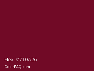 Hex #710a26 Color is a dark rose color and the nearest color is Black Rose #67032d. Hex code #710a26 and RGB value is rgb(113,10,38). In RGB color space, this color is composed of 44% red, 4% green, 15% blue, In CMYK color space, this color is composed of 0% cyan, 91% magenta, 66% yellow , 56% black , In HSL color space, this color has a hue angle of 344° , 84% saturation and 24% lightness.